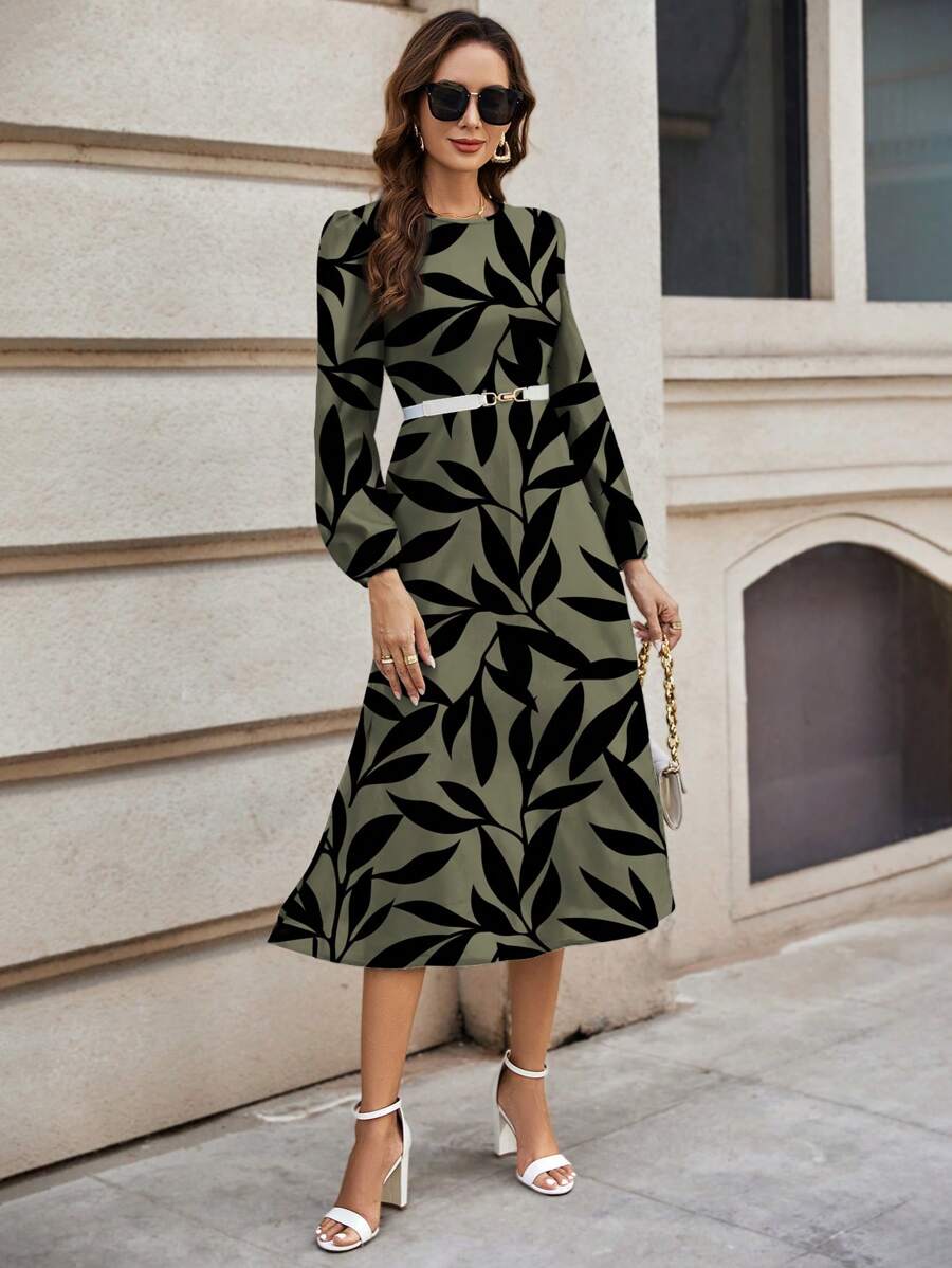Alonic Fab Elegant Olive Green Midi Dress with Black Leaf Print & Belted Waist