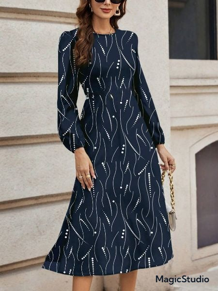 Alonic Fab Elegant Navy Blue Midi Dress with Abstract Dot and Line Print β Long Sleeve, High Waist