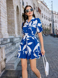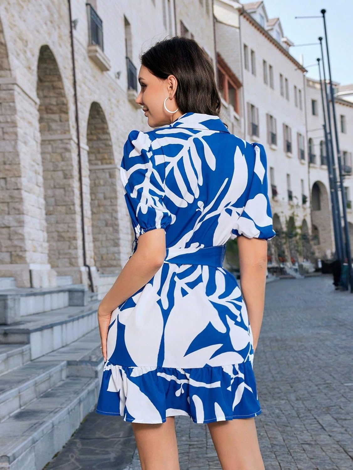 Step into effortless elegance with this chic Blue Tropical Leaf Print Mini Dress. Featuring a striking white botanical pattern against a vibrant blue backdrop, this button-down dress brings a fresh and modern twist to classic summer style. The short puffed sleeves and ruffled hem add a touch of femininity, while the matching waist belt cinches the silhouette for a flattering, hourglass shape. Made from lightweight, breathable fabric, it's perfect for warm days, beach strolls, or casual brunches with friends. Pair it with sunglasses and hoop earrings for an effortlessly polished look.