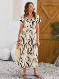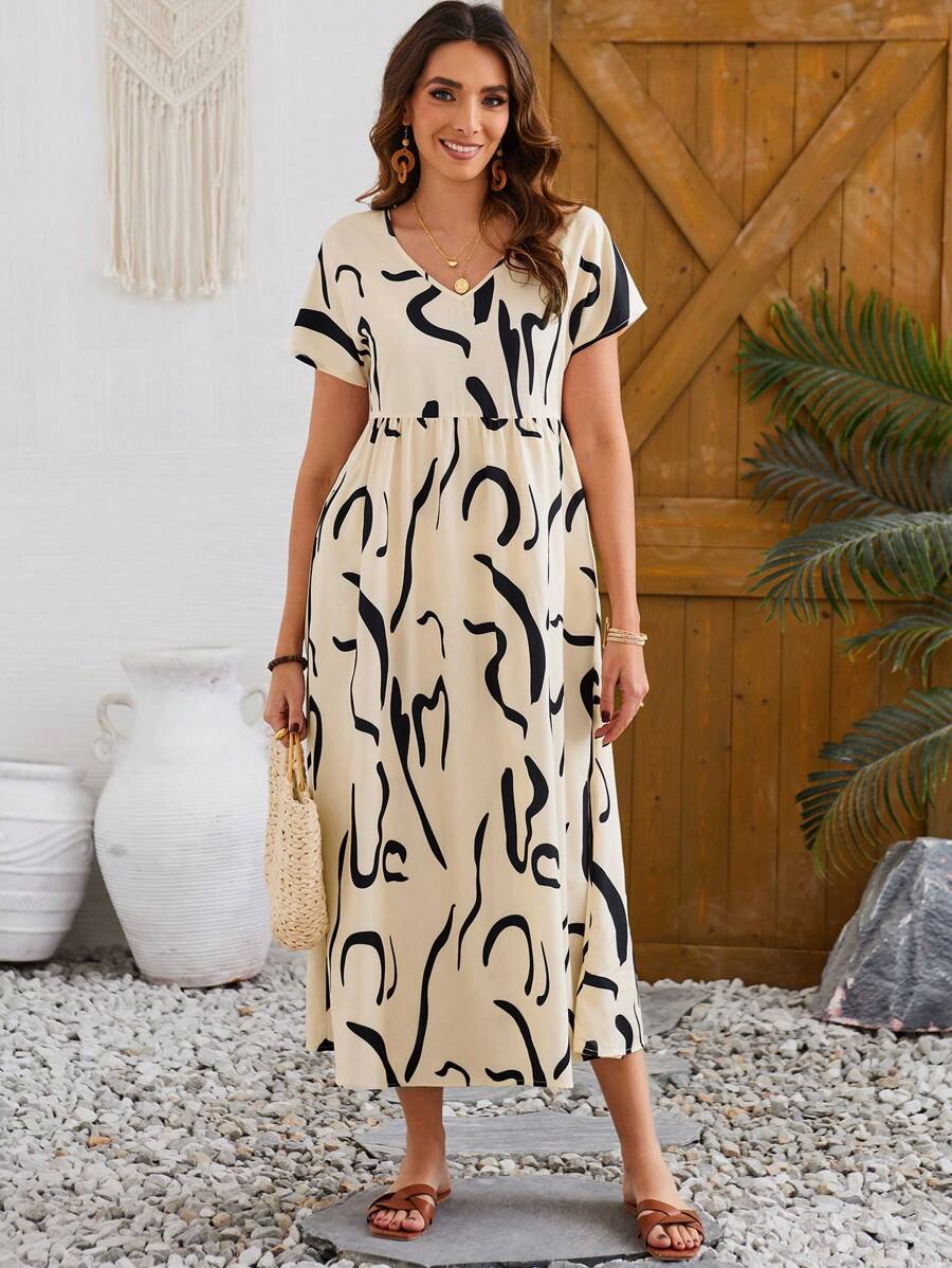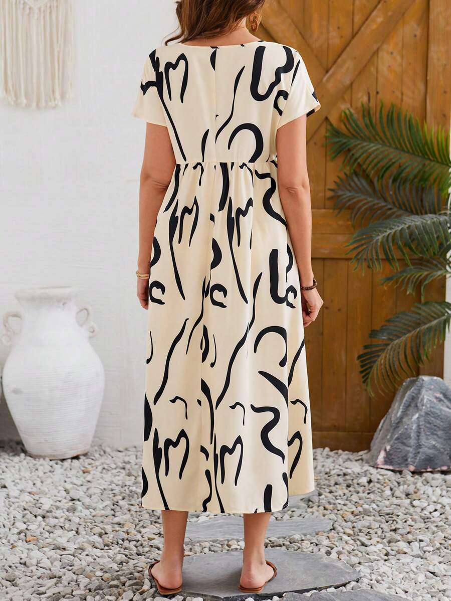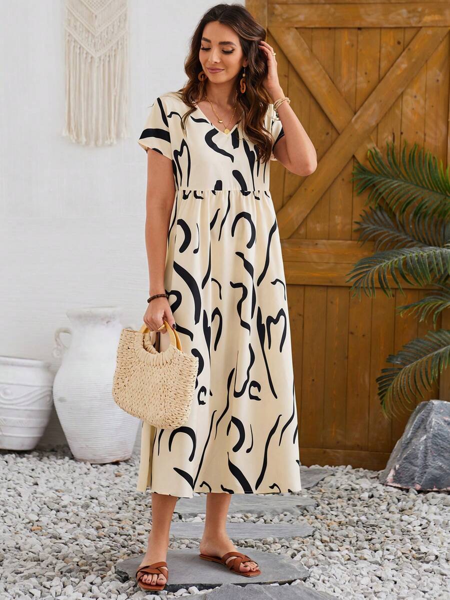 This dress features a relaxed and breezy design, perfect for casual and summer settings. The dress has a light cream-colored base adorned with bold, abstract black brushstroke patterns, giving it a modern and artistic feel. It has a V-neckline and short sleeves, offering a comfortable and airy fit. The empire waistline adds a touch of structure while maintaining a flowy silhouette that falls to a midi length.