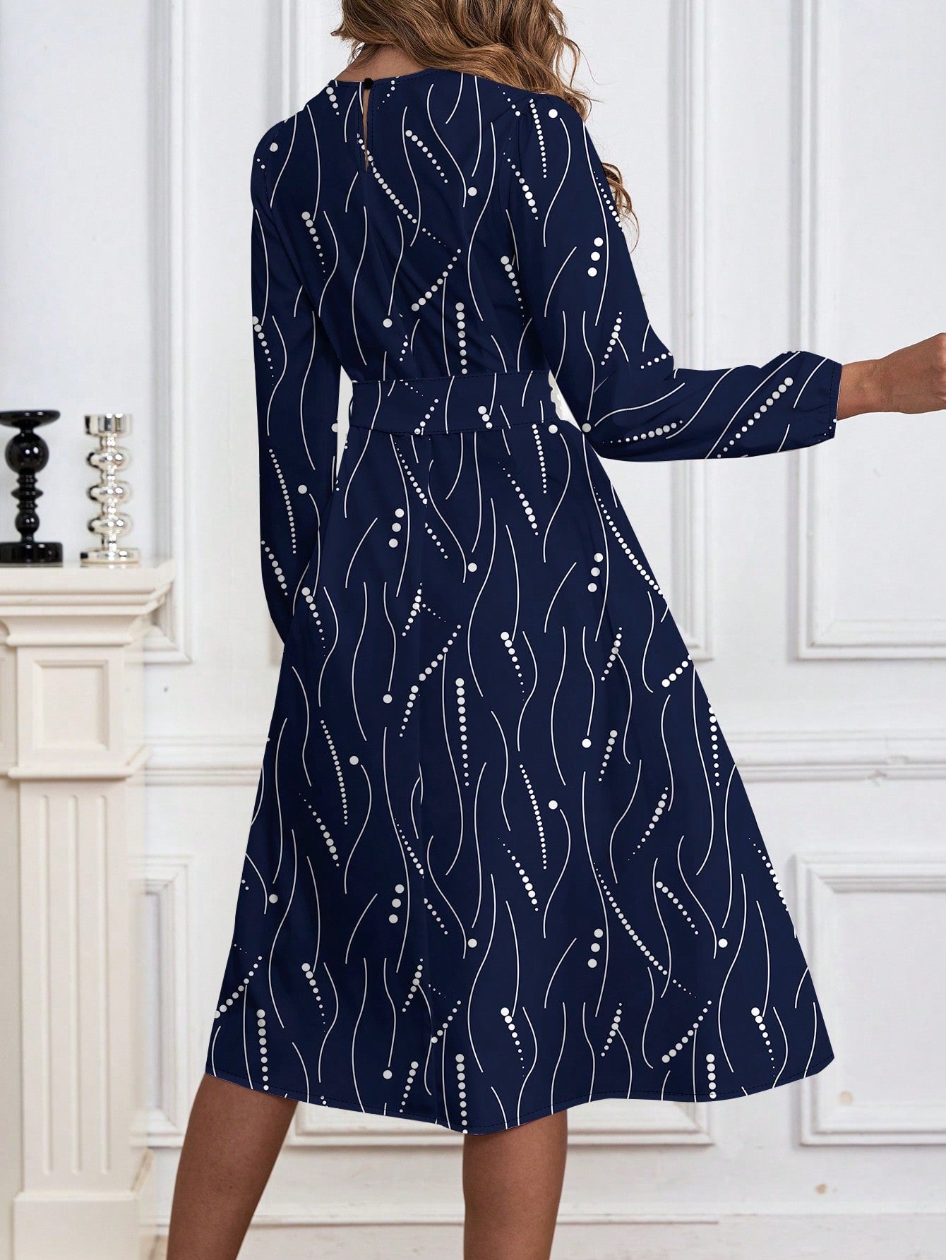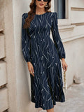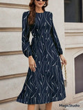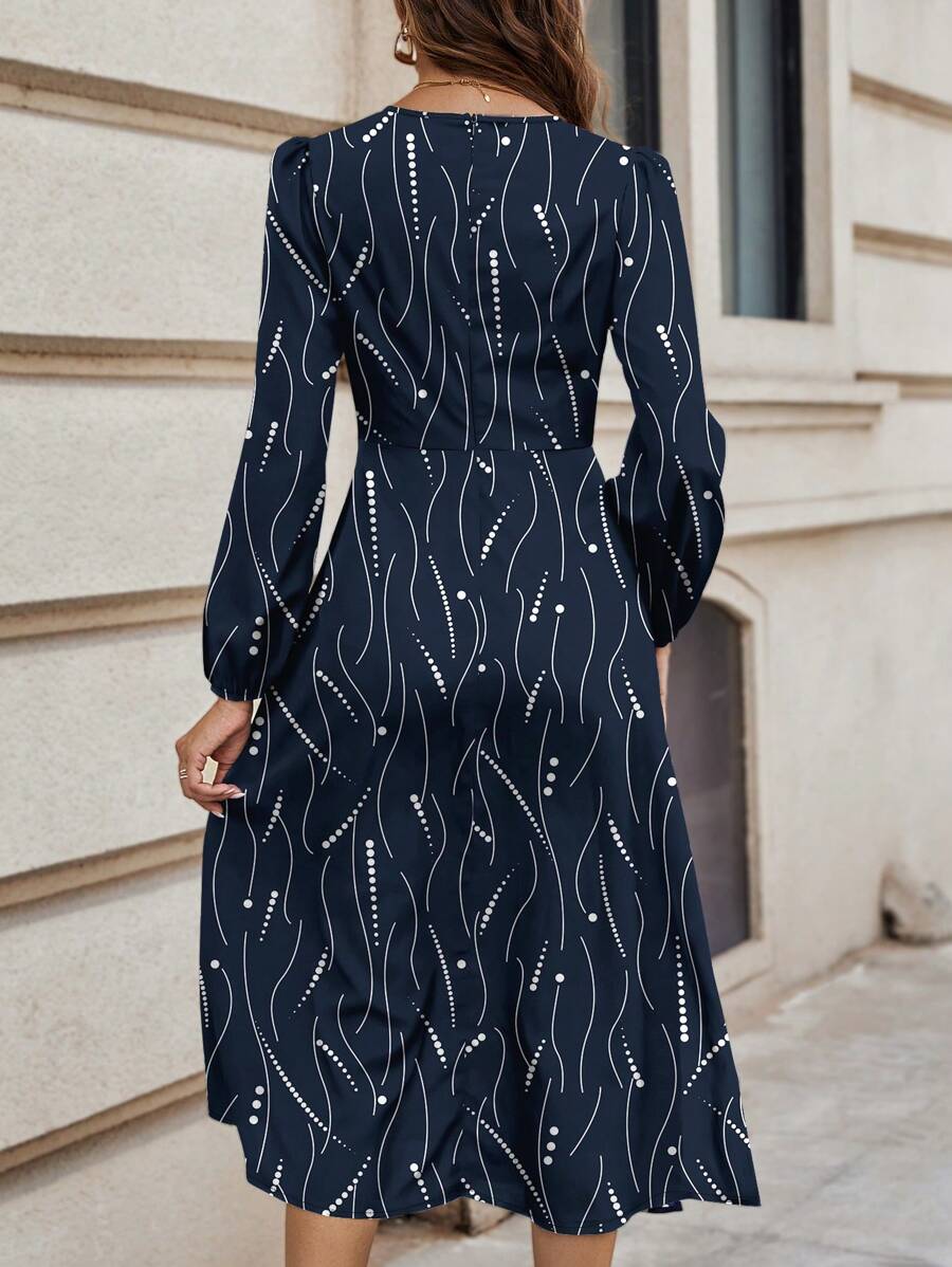 Alonic Fab Elegant Navy Blue Midi Dress with Abstract Dot and Line Print – Long Sleeve, High Waist