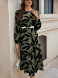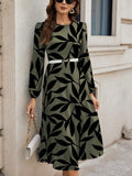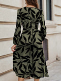 Alonic Fab Elegant Olive Green Midi Dress with Black Leaf Print & Belted Waist
