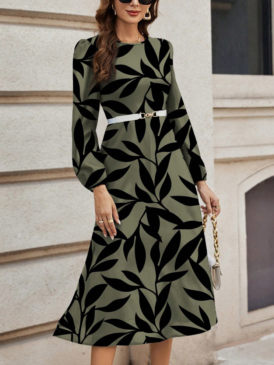 Elevate your style with this Elegant Olive Green Midi Dress, featuring a stunning black leaf print for a chic and sophisticated look. Designed with long puffed sleeves, a round neckline, and a flattering A-line silhouette, this dress offers both comfort and elegance. The adjustable white belt cinches the waist for a graceful, feminine touch.