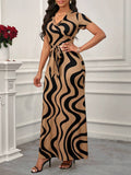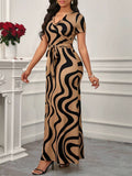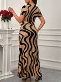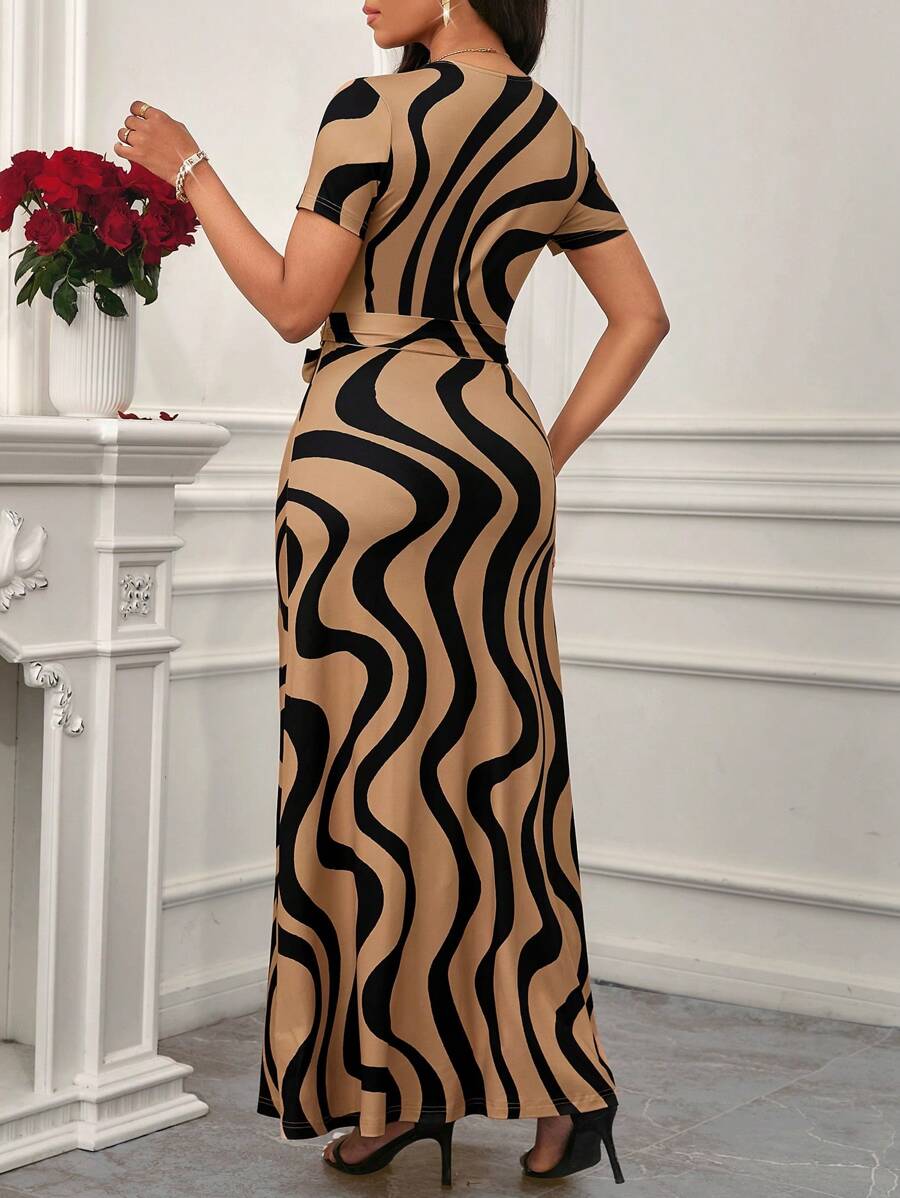 Make a bold statement with this Elegant Wave-Print Wrap Maxi Dress. Designed for style and comfort, this dress features a sleek V-neckline, short sleeves, and a tie-waist belt that enhances your silhouette. The flowing maxi length adds a touch of sophistication, making it perfect for both casual and formal occasions. The eye-catching black wave pattern on a camel background creates a chic, modern look that stands out effortlessly.