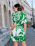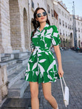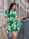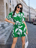 Alonic fab Green Tropical Leaf Print Button-Down Belted Mini Dress