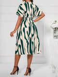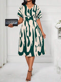 Step into effortless elegance with this Chic Abstract Print V-Neck Midi Dress. Featuring a stunning green and beige artistic pattern, this dress is perfect for both casual outings and special occasions.