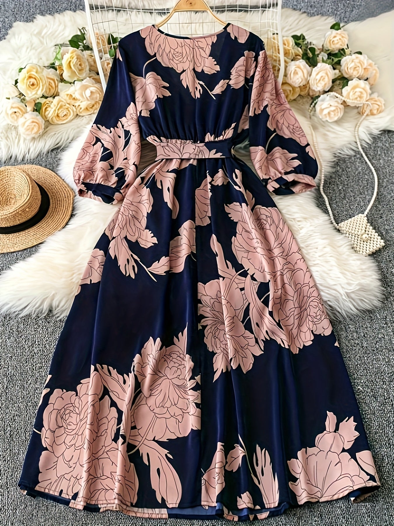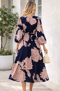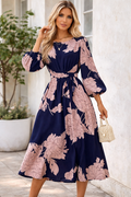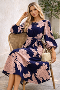 Alonic Fab Navy Blue Floral Print Long Sleeve Midi Dress for Women