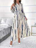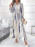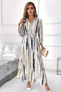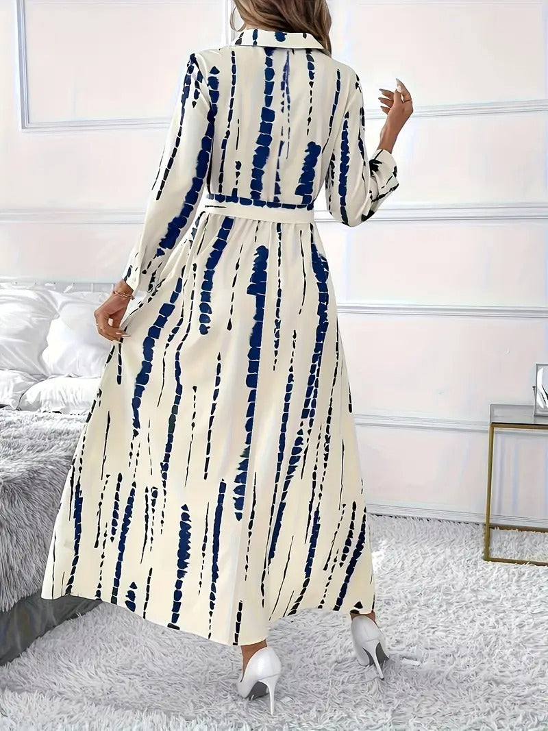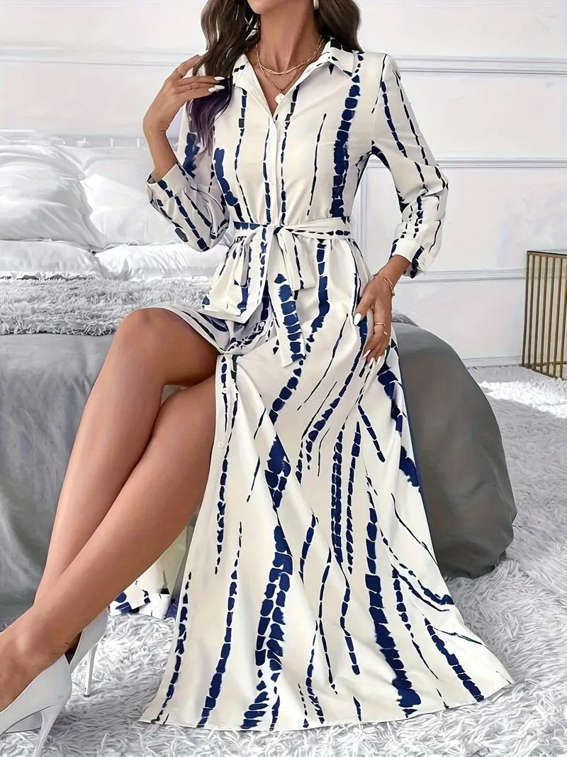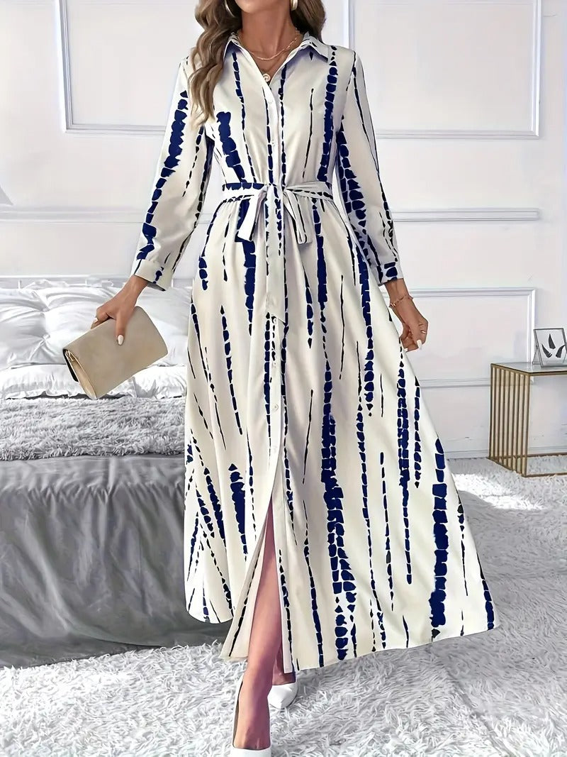This dress features a bold navy blue and white color scheme with an eye-catching large floral print. The design includes a classic shirt collar, a button-down front, and a tie-waist belt that accentuates the silhouette. The sleeves are three-quarter length with a slightly ruched detail, adding a casual yet polished touch. The midi length and tiered hem provide a relaxed and flowy fit, perfect for both casual outings and semi-formal occasions. The overall vibe of the dress is effortlessly chic, combining comfort with style. It can be easily dressed up with heels and accessories or kept casual with flats or sandals.