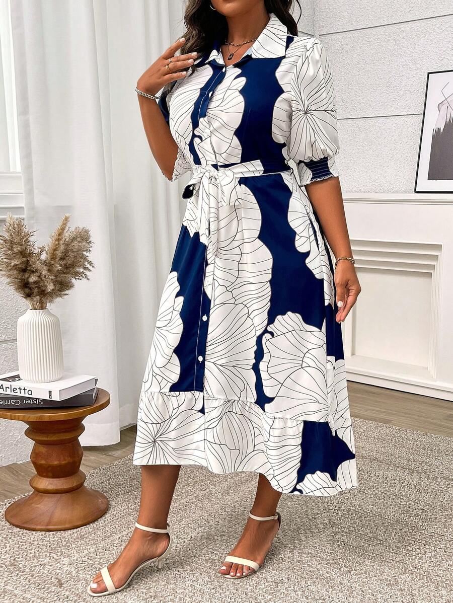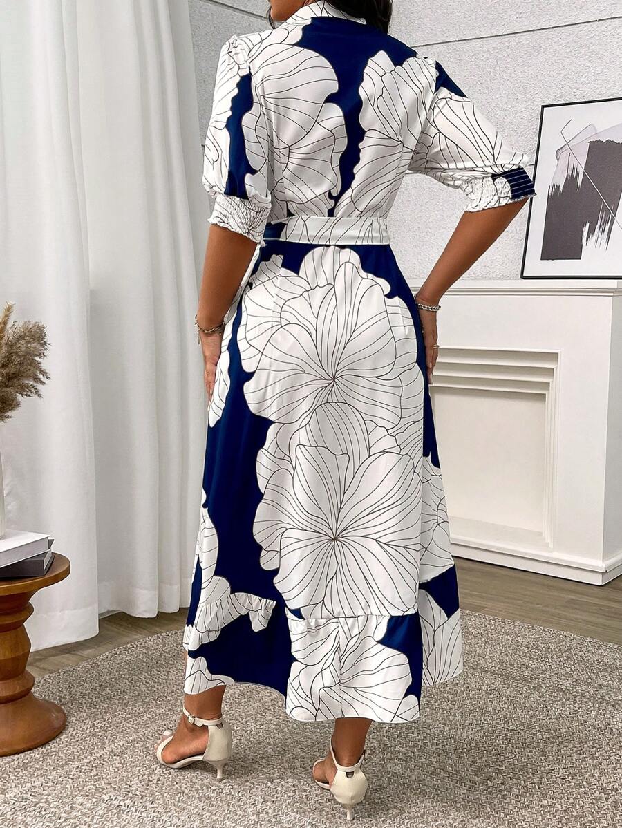 This dress features a bold navy blue and white color scheme with an eye-catching large floral print. The design includes a classic shirt collar, a button-down front, and a tie-waist belt that accentuates the silhouette. The sleeves are three-quarter length with a slightly ruched detail, adding a casual yet polished touch. The midi length and tiered hem provide a relaxed and flowy fit, perfect for both casual outings and semi-formal occasions. The overall vibe of the dress is effortlessly chic, combining comfort with style. It can be easily dressed up with heels and accessories or kept casual with flats or sandals.