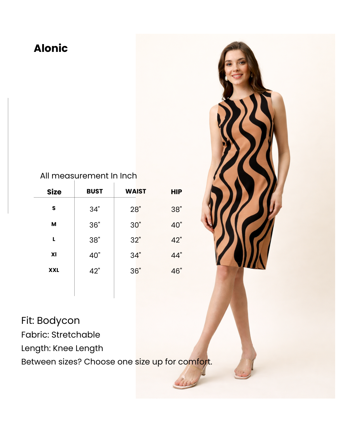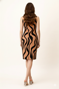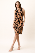 Turn heads with this brown and black wave print bodycon dress, designed to highlight your curves with effortless elegance. Featuring a sleek sleeveless design and a knee-length bodycon fit, this dress delivers a bold yet classy look that’s perfect for modern women.